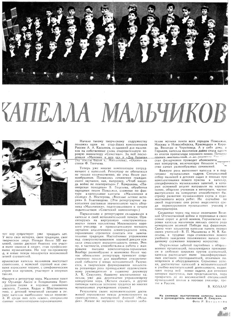 A y себя дома, в Горьком, капелла мальчиков давно стала одним из очагов пропаганды хорового пения. Помимо прочих выступлений с ее участием, Горьковская филармония проводит абонементы хоровых концертов, включающие большое количество самых разнообразных сочинений. Важную роль выполняет капелла и в подготовке музыкальных кадров. Специальный отбор малышей в детских садах и школах при комплектовании нового приема в капеллу, специфичность музыкальных занятий, в которых основной акцент направлен на хоровое пение, общение учеников в интернате, частые выступления концертах способствуют быстрому развитию музыкального слуха и художественного вкуса ребят. He случайно по своей подготовке они резко выделяются среди первокурсников музыкальных училищ и консерватории.